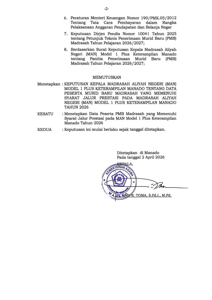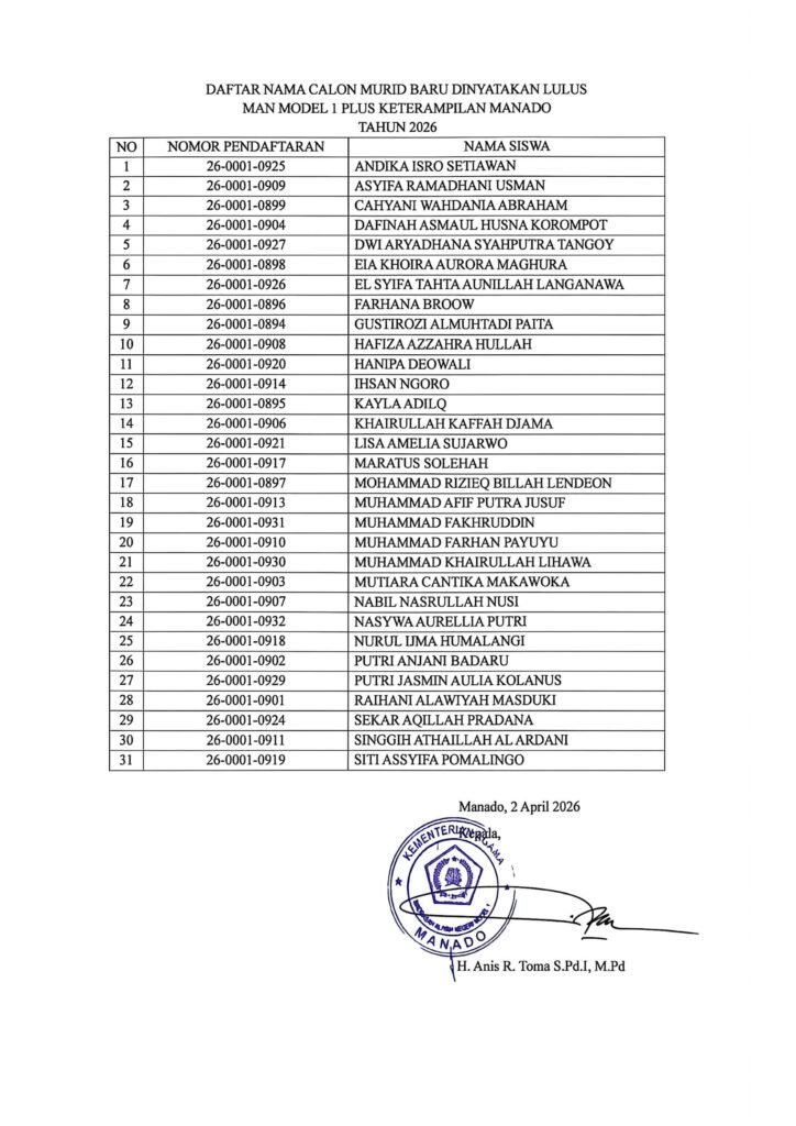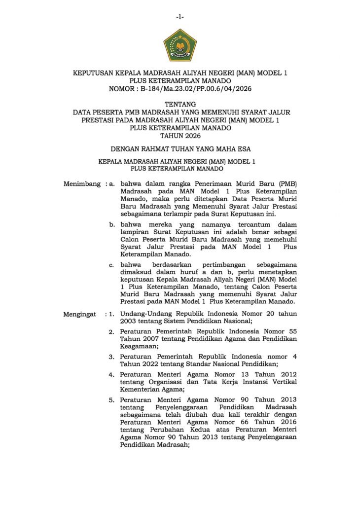Berikut kami sampaikan Surat Keputusan Kepala Madrasah MAN Model 1 Manado tentang peserta Penerimaan Murid Baru (PMB) yang LULUS jalur PRESTASI MAN Model 1 Manado tahun 2026.