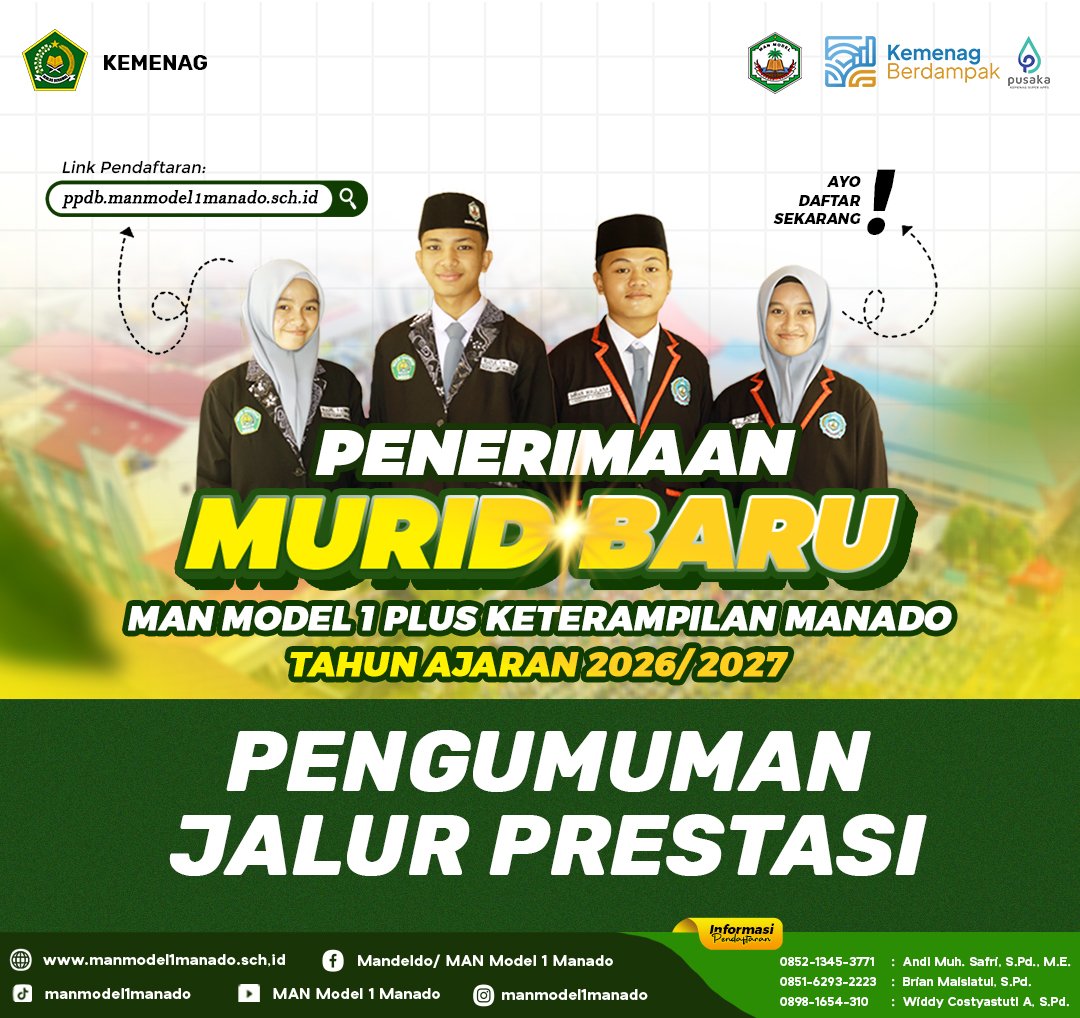 Bagi Peserta PMB yang dinyatakan LULUS melalui jalur prestasi agar melakukan Pemberkasan/ Pendaftaran Ulang pada tanggal 17-19 Juni 2026 di MAN Model 1 Manado dengan membawa seluruh Persyaratan/ Berkas yang diminta.